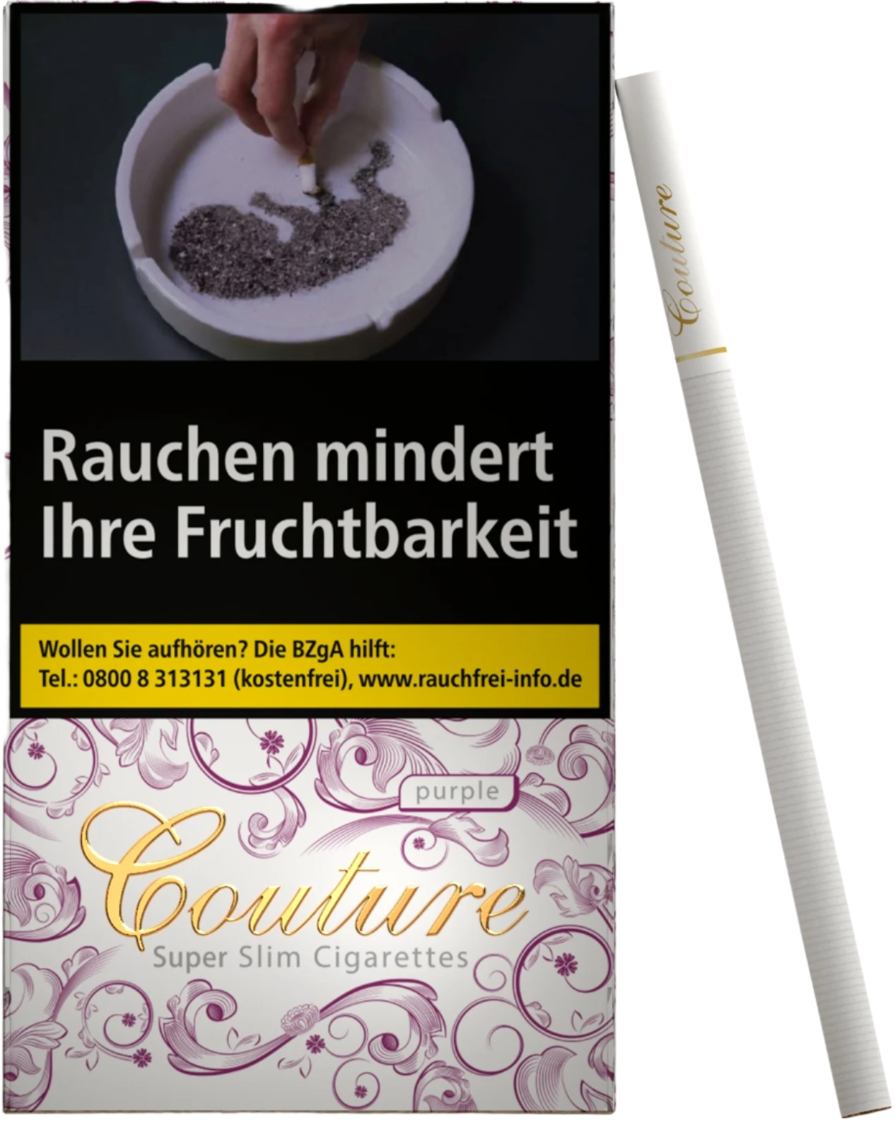 Die Couture Zigaretten Purple Slim bieten ein raffiniertes und mildes Geschmackserlebnis mit der klassischen **American Blend** Mischung. Diese Zigaretten sind ideal für Raucher, die eine elegante und angenehm zu rauchende Zigarette bevorzugen. Denken Sie jedoch daran, dass der Tabakkonsum gesundheitsschädlich ist und Risiken birgt.