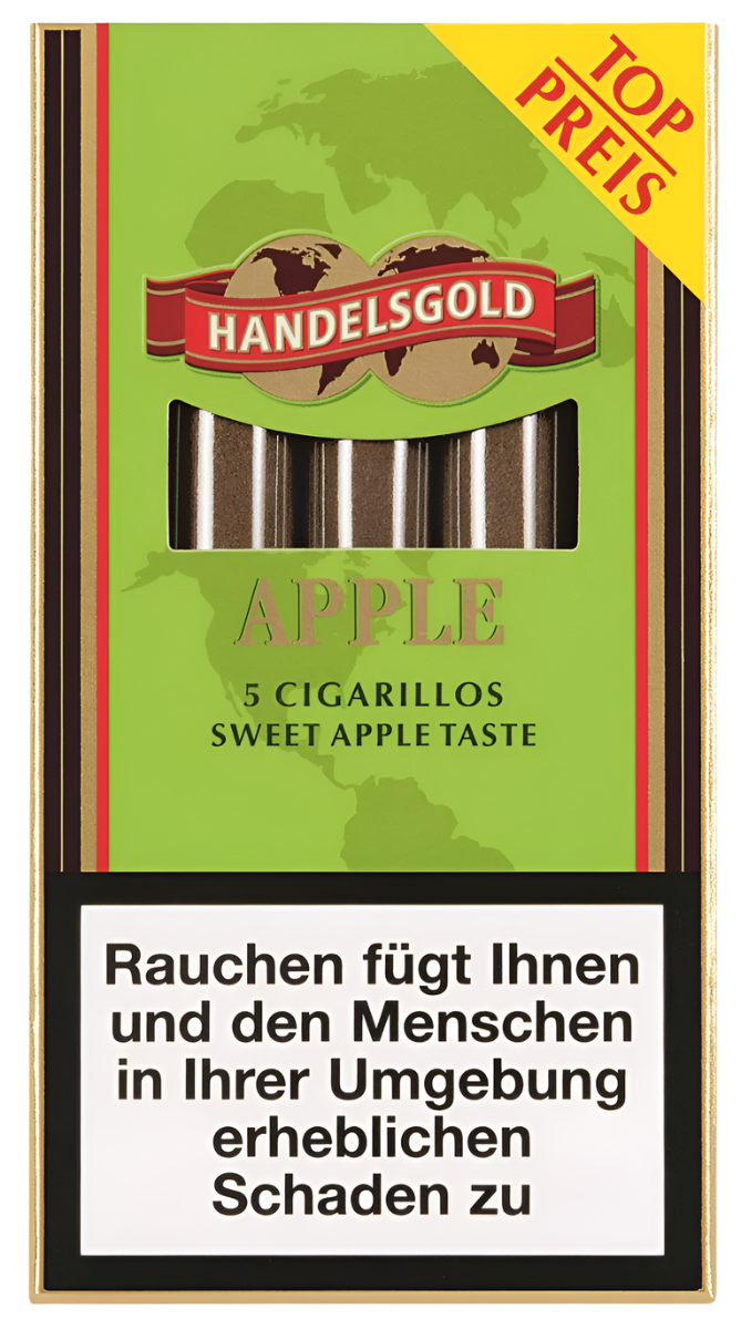 Die Handelsgold Green (Apple) Zigarillos bieten ein fruchtiges Apfel-Aroma kombiniert mit einem milden Rauchvergnügen.