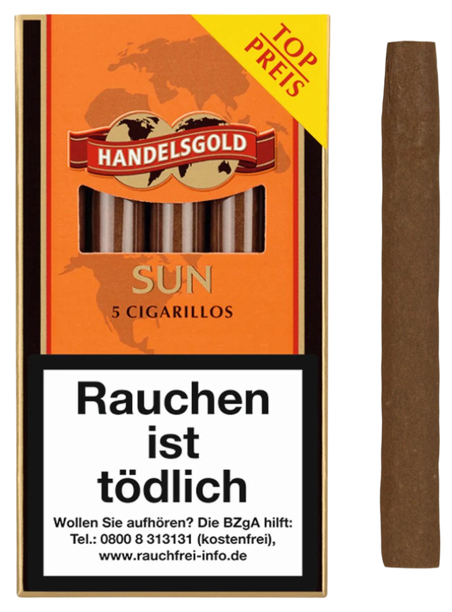 Genießen Sie die feinen Handelsgold Sun (Peach) Zigarillos mit intensivem Aroma von sonnengereiften Pfirsichen.
