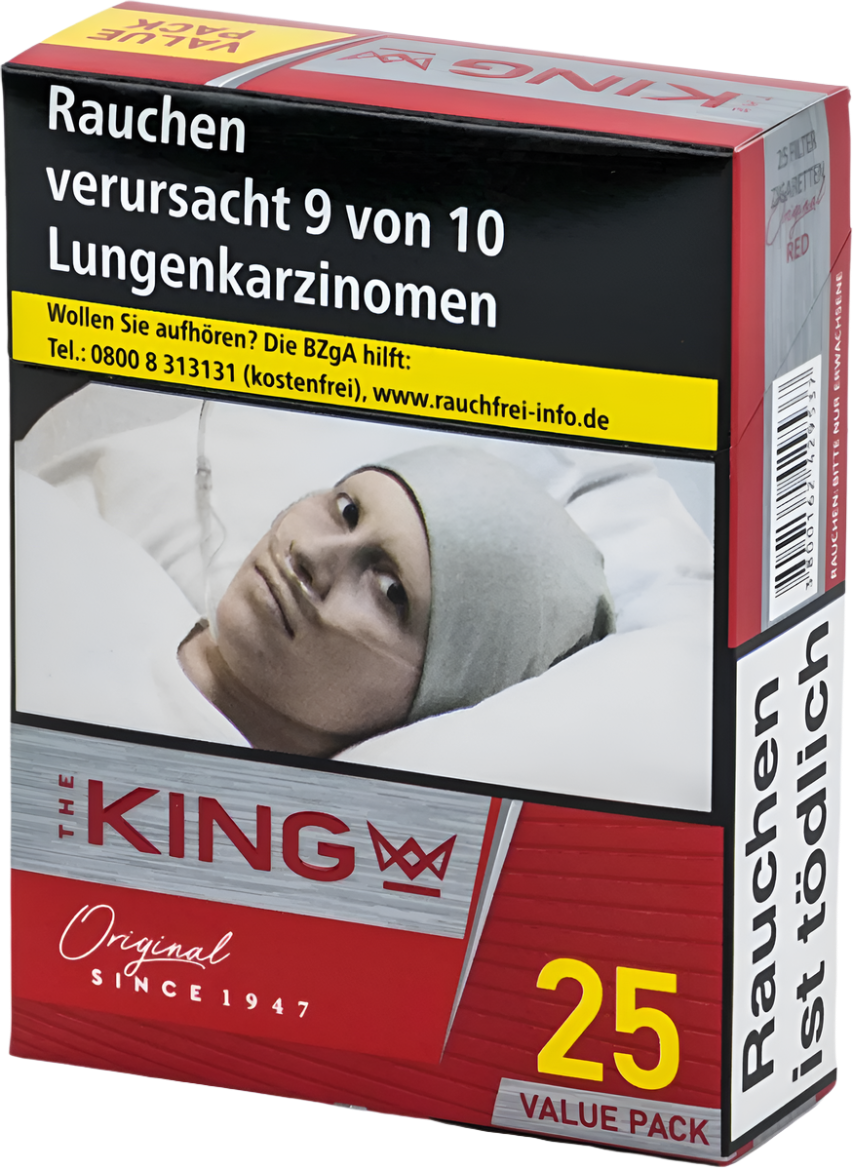 Der Verkauf und Konsum von Tabakwaren unterliegt strengen gesetzlichen Vorschriften. In Deutschland ist der Verkauf von Tabakprodukten an Minderjährige (unter 18 Jahren) gesetzlich verboten. Der Erwerb von King Zigaretten Red XL ist nur für volljährige Personen erlaubt.